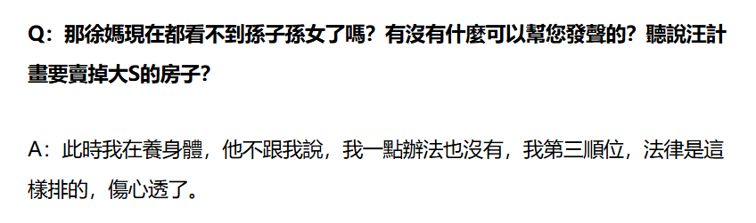 被问到现在看不到孙子孙女了吗?汪小菲要卖掉房子一事是否属实?大S妈妈表示正在养身体,汪小菲不说的话,她没有一点办法,因为她是遗产第三顺位继承人,法律的安排让人伤透了心,控诉遗产安排不公。