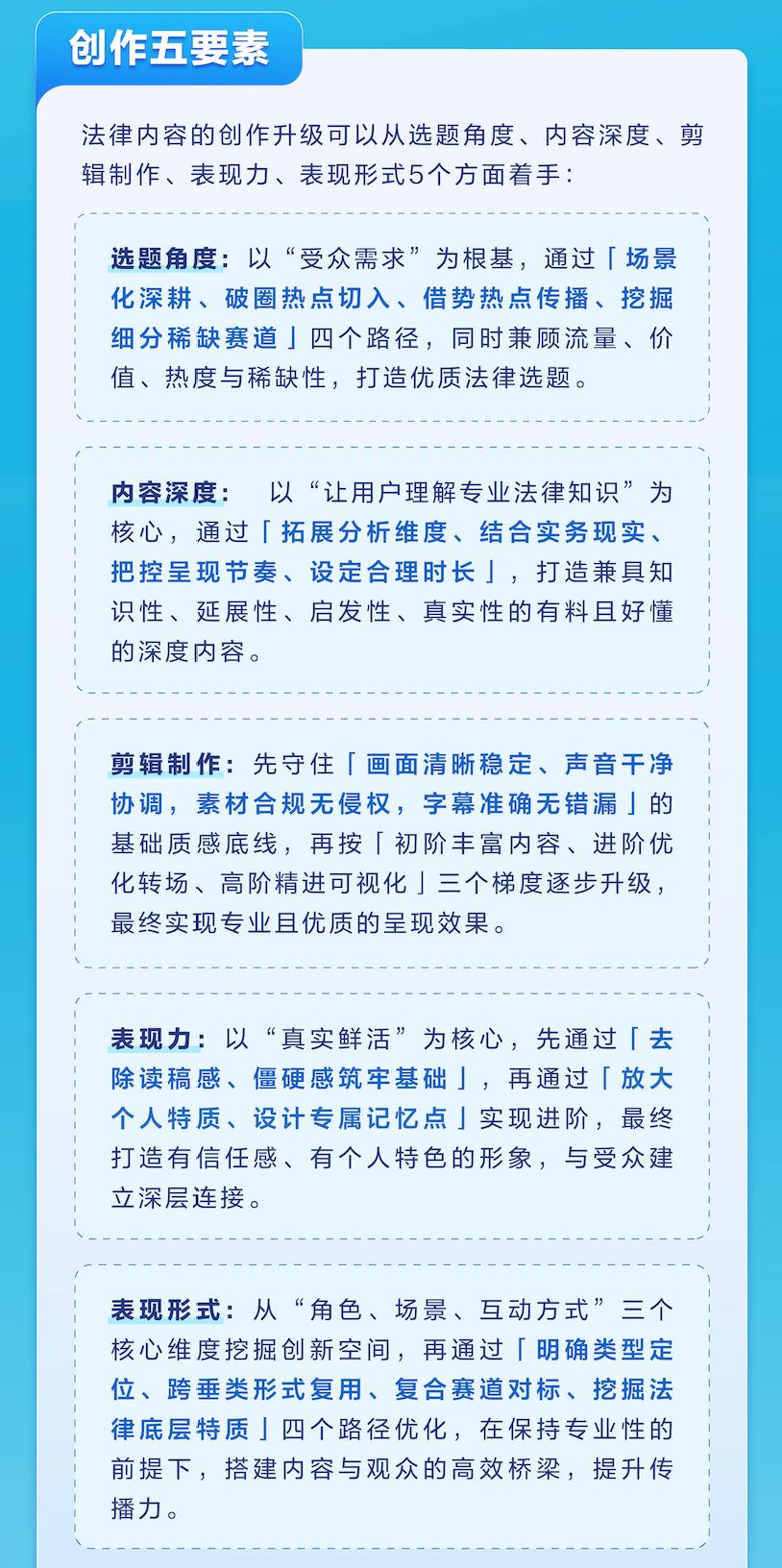 此外,抖音还同步发布了《白皮书》,从选题角度、内容深度、剪辑制作、表现力、表现形式5个方面总结了法律优质内容创作方法论,为创作者给出了具体指引。