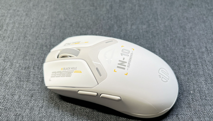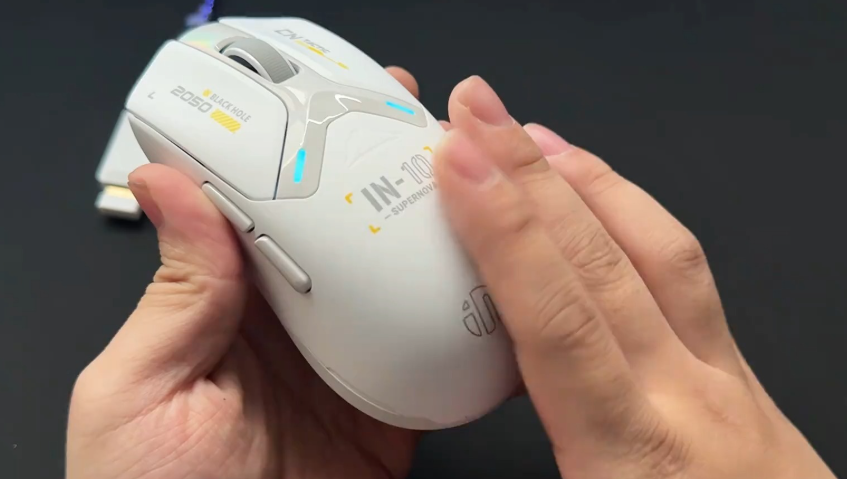 IN9 PRO只有黑色一款颜色可选,IN10则有黑和白色两款配色可选。我个人特别喜欢IN10的星辉白配色,在光线照射下呈现出细腻的金属质感,让人眼前一亮。仔细看这款鼠标,即使加入了RGB灯组件,其重量仍被控制在60多g,轻量化表现非常出色,试过就知道。