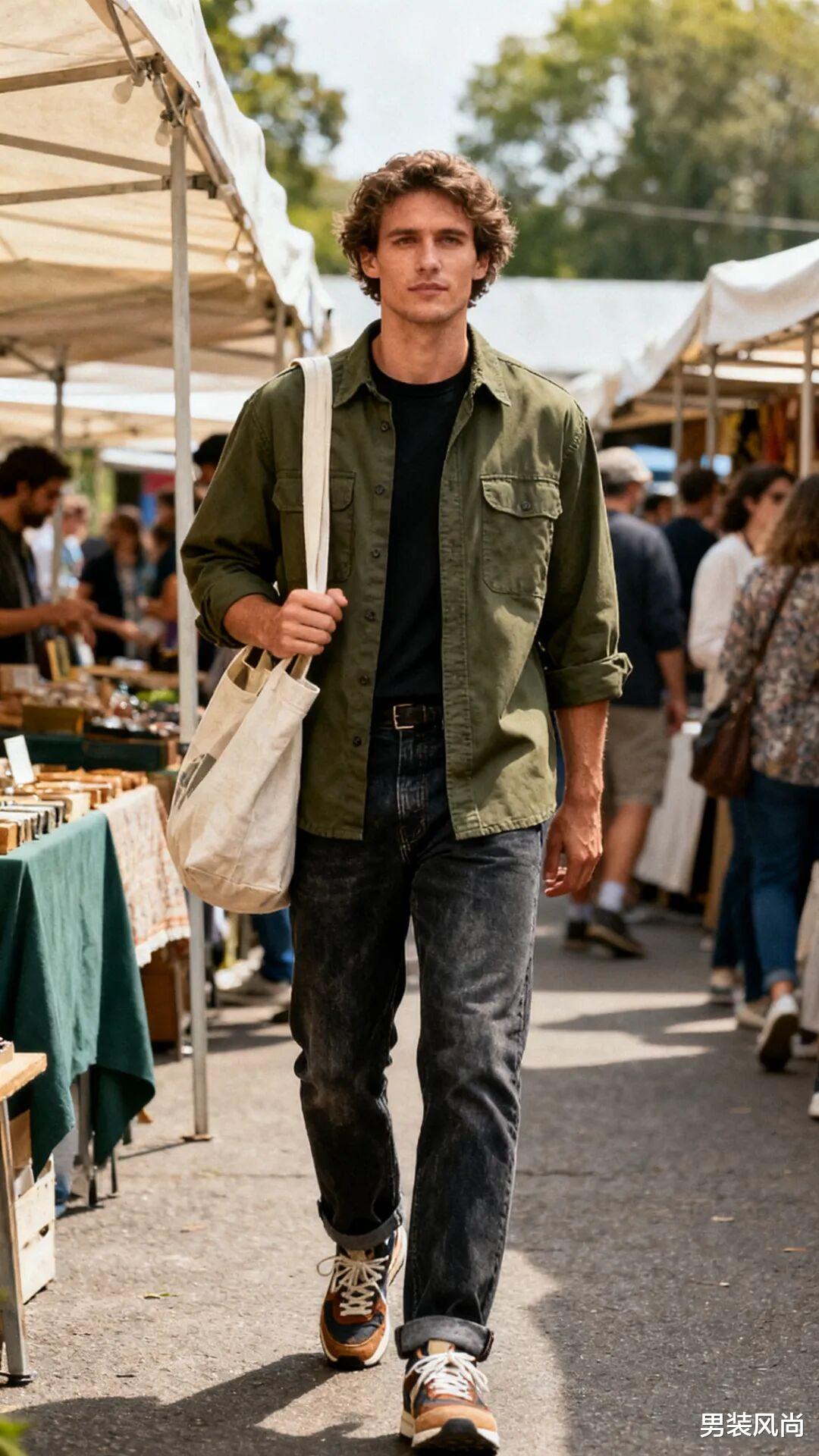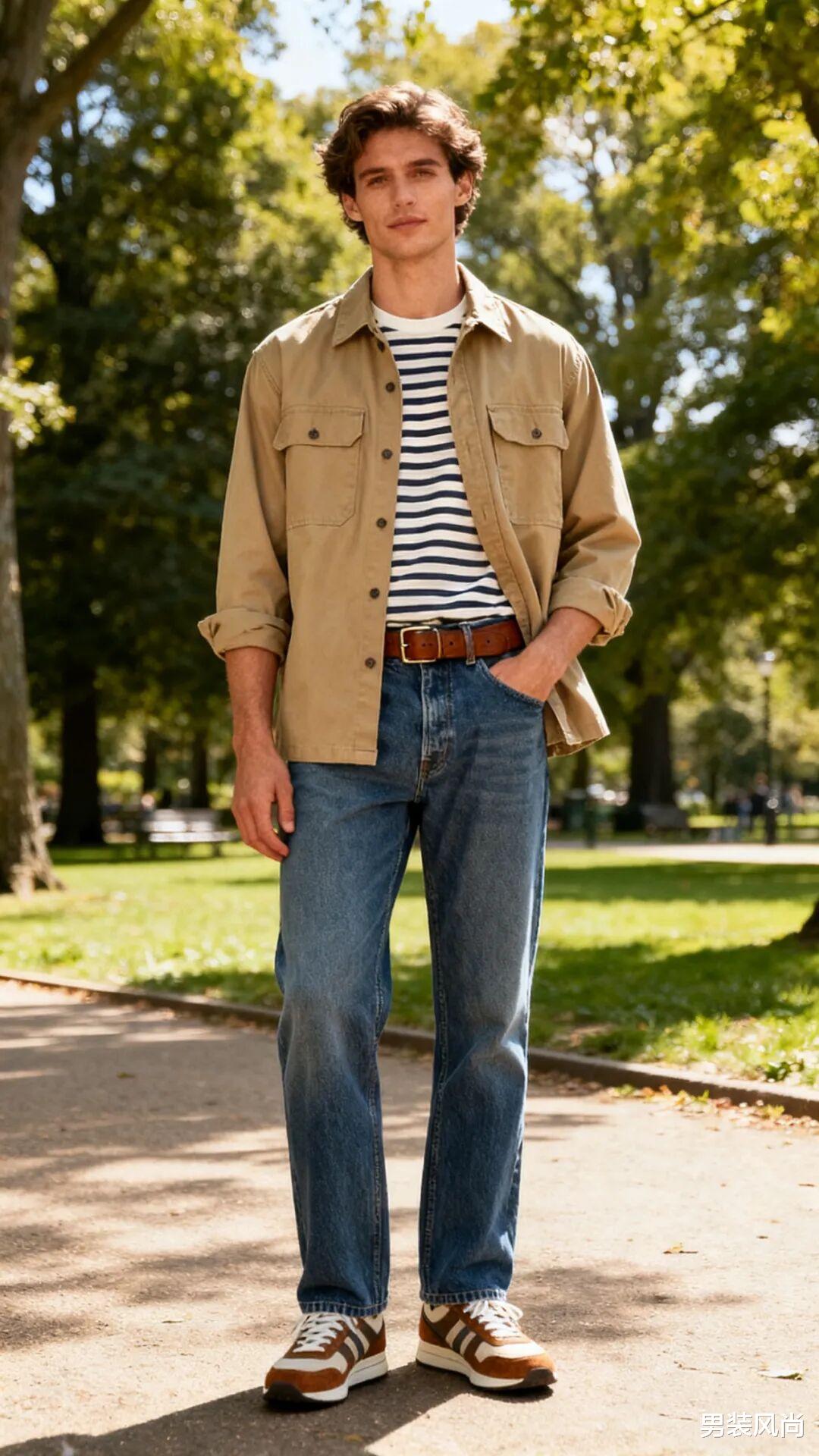 • 周末休闲:主打舒适随性,简化搭配层次。工装衬衫单穿,内搭条纹T恤,下装搭配直筒牛仔裤和复古运动鞋,腰间系一条皮质皮带,慵懒又不失型格;天气微凉时,外搭一件轻薄的棒球服,轻松惬意,逛超市、见朋友、公园散步都合适。