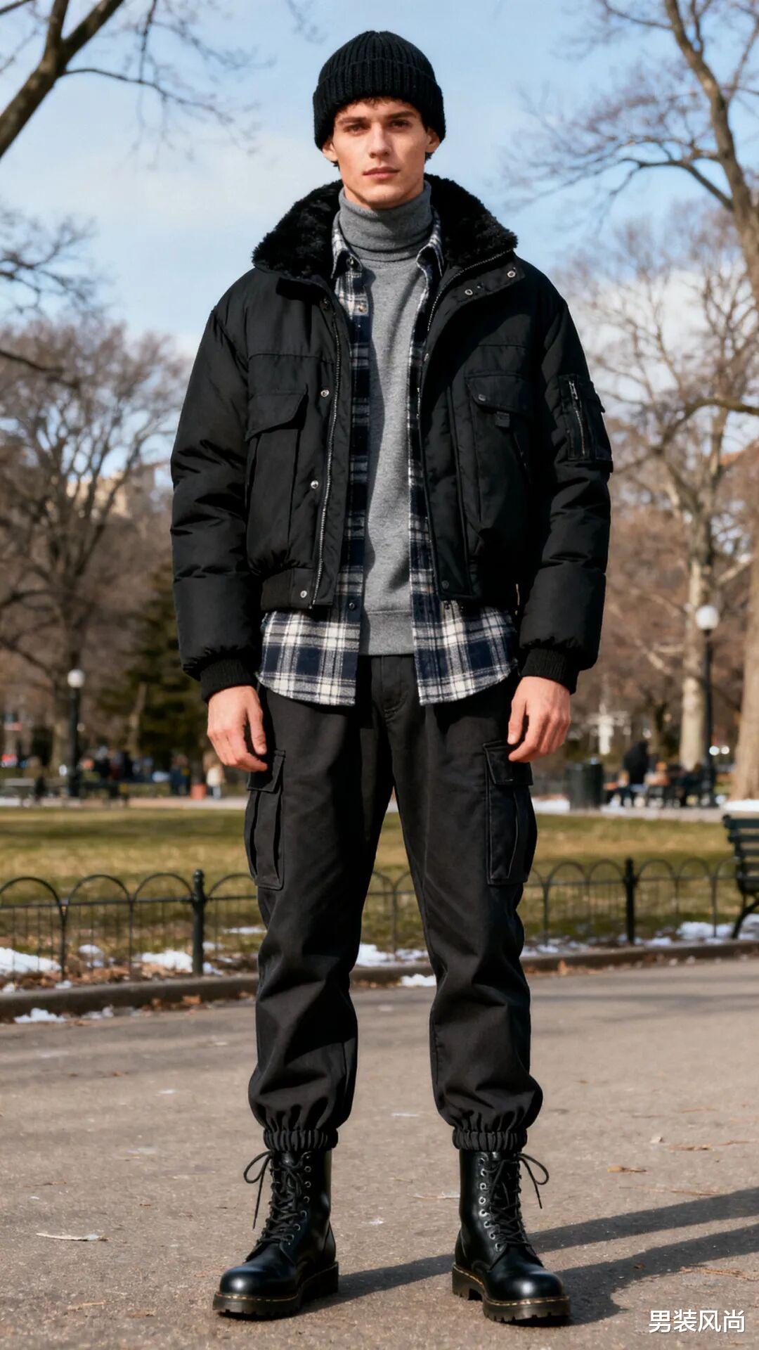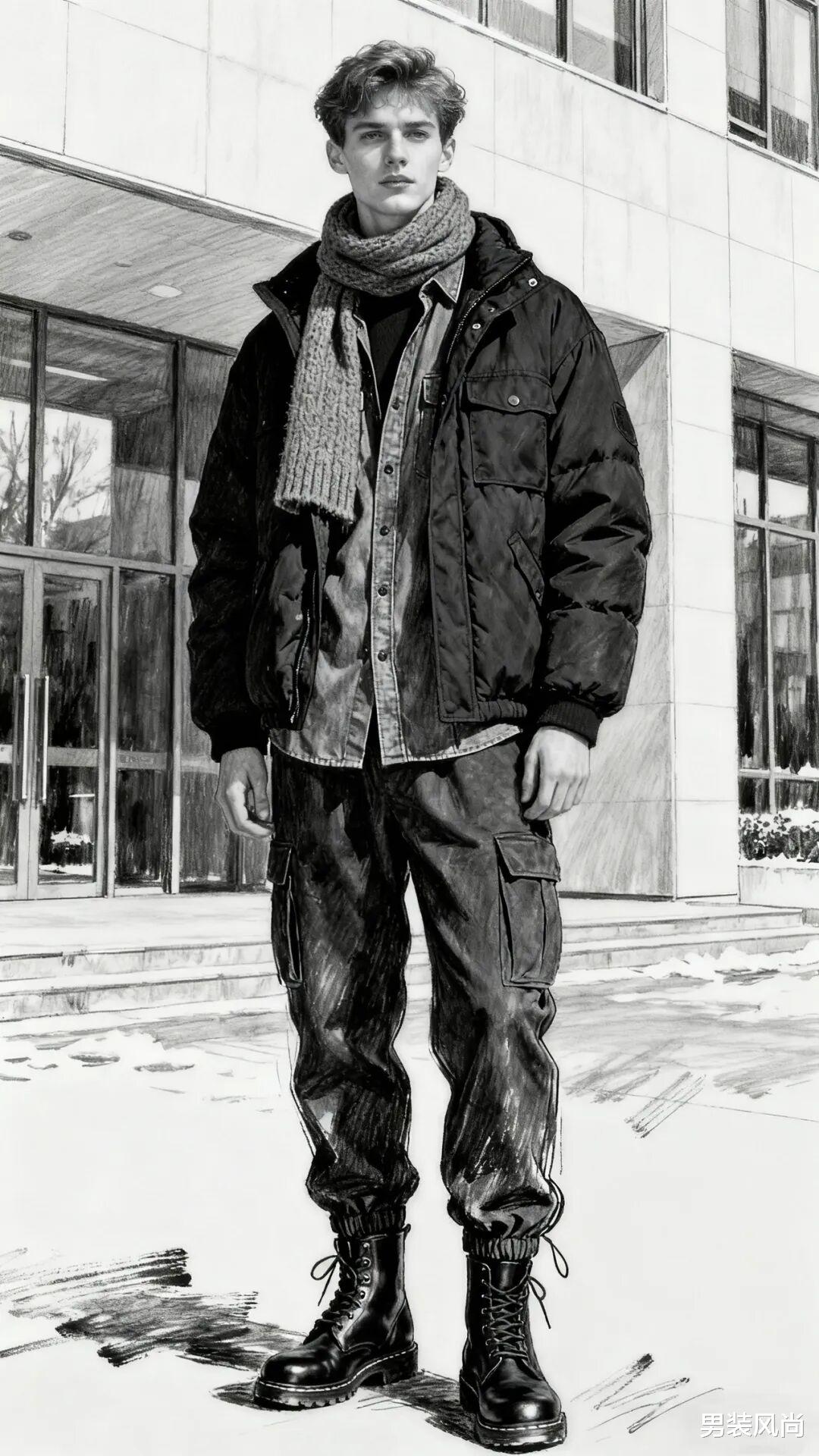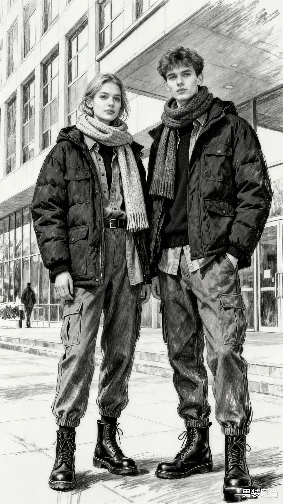 • 保暖款(北方寒冬):薄款棉服 + 工装衬衫 + 基础打底 + 束脚工装裤 + 马丁靴 + 围巾。三层叠加由薄到厚,棉服选短款廓形,避免臃肿;围巾选羊毛材质,颜色与外套呼应,保暖的同时提升整体质感,通勤、户外出行都能hold住。