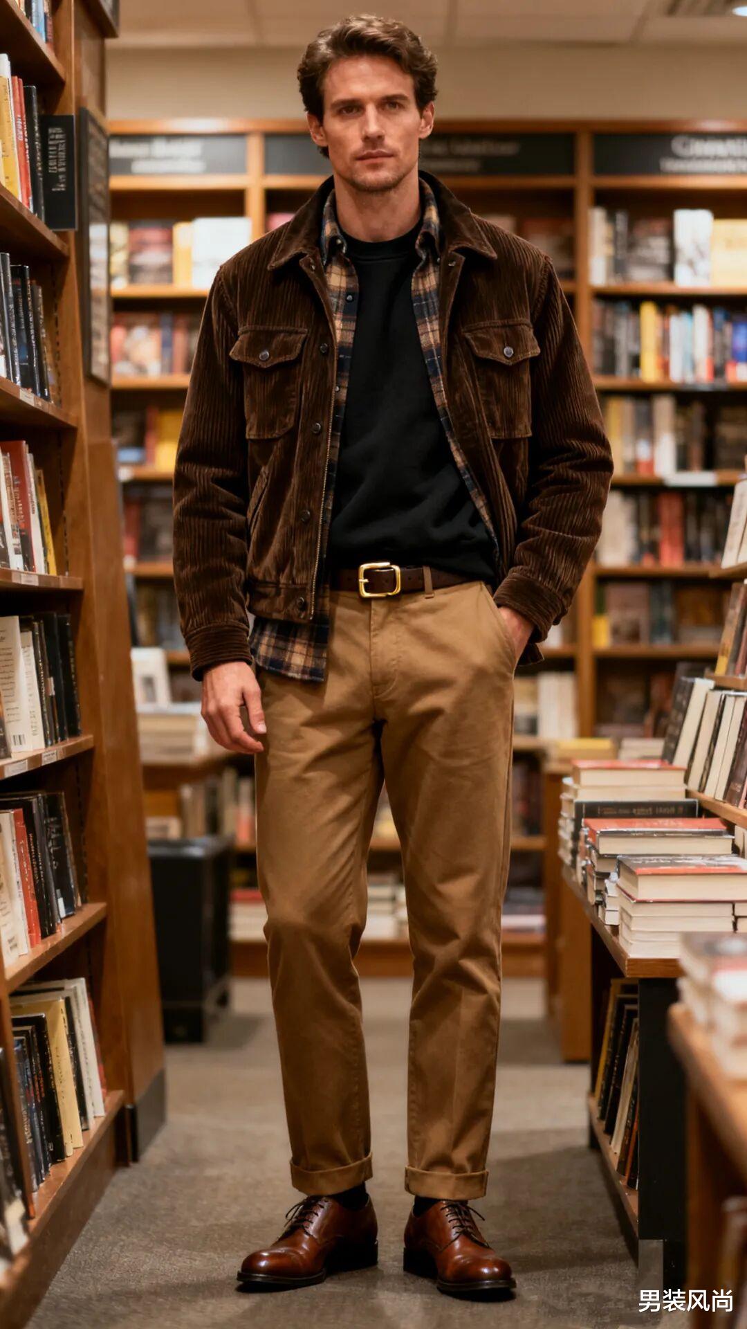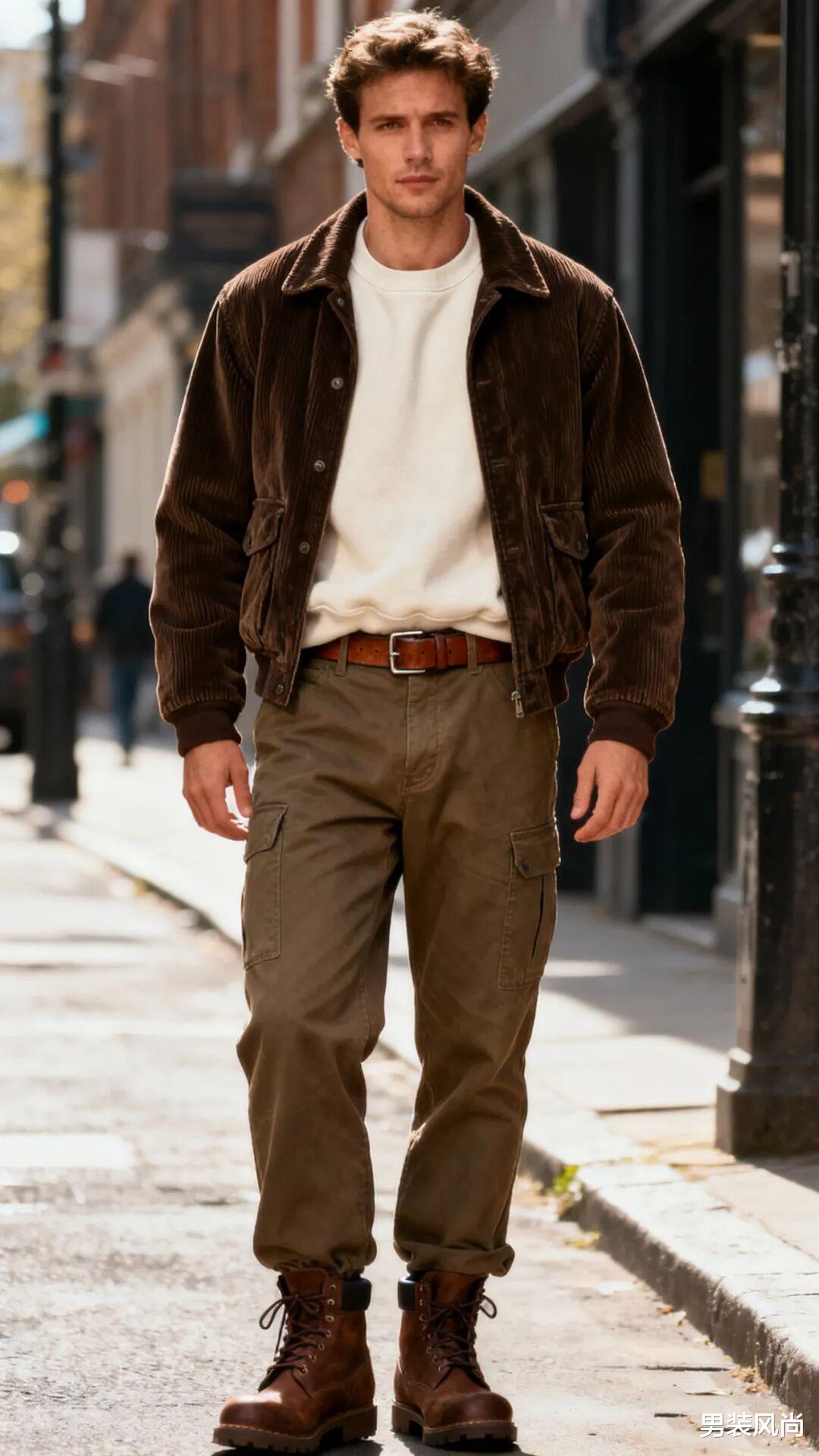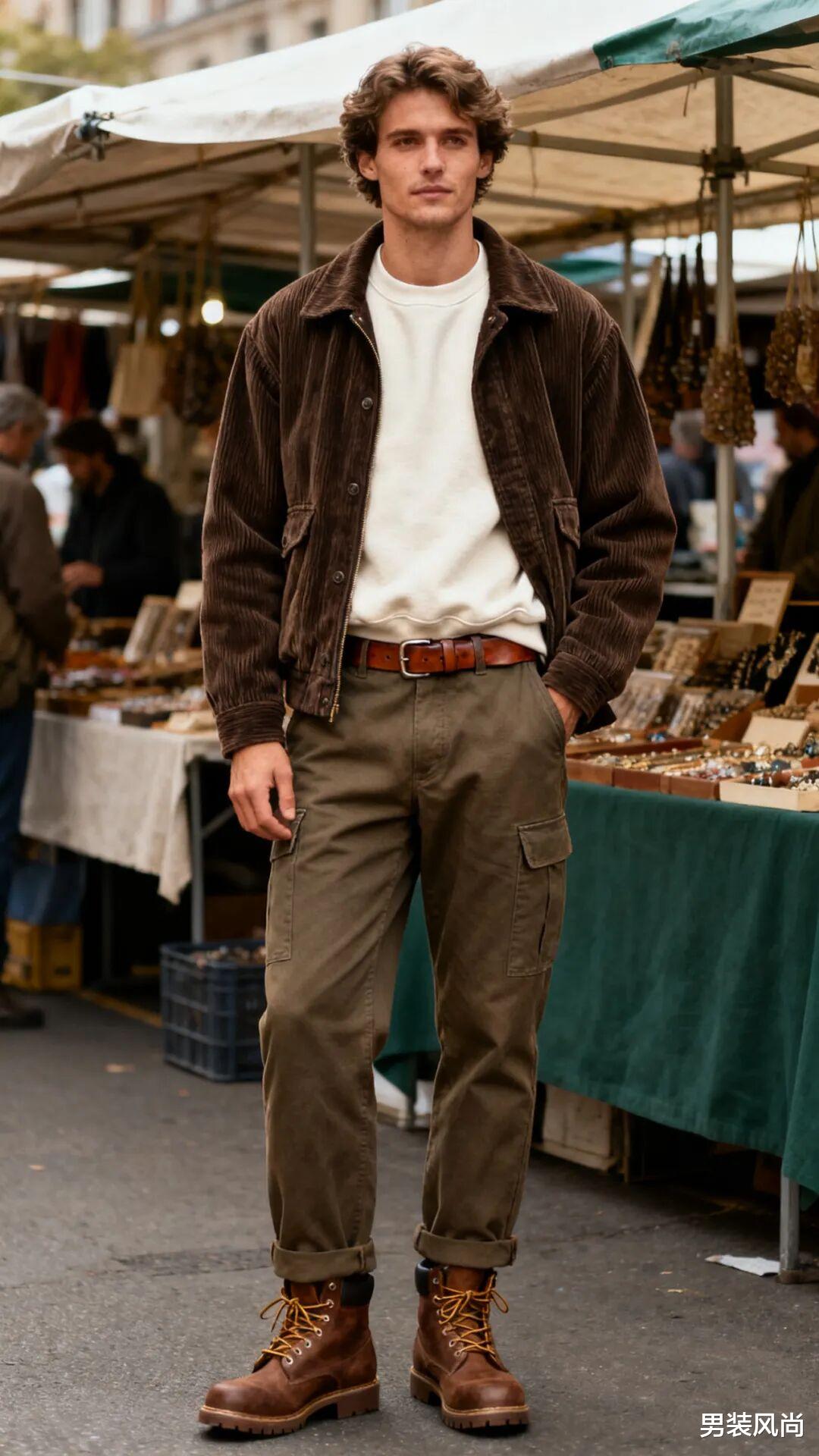 • 基础款(日常出街):灯芯绒夹克 + 重磅卫衣 + 直筒工装裤 + 工装短靴 + 皮质皮带。外松内紧,层次分明,保暖又利落,逛市集、喝咖啡、日常通勤都能穿,懒人直接抄作业。