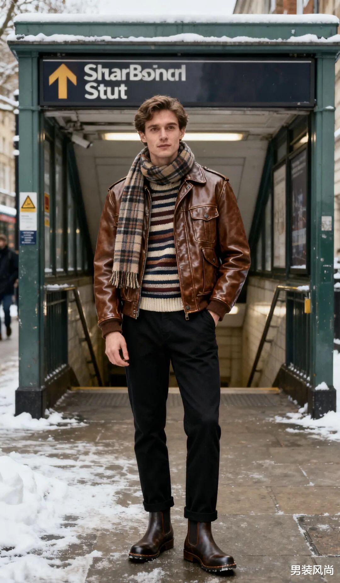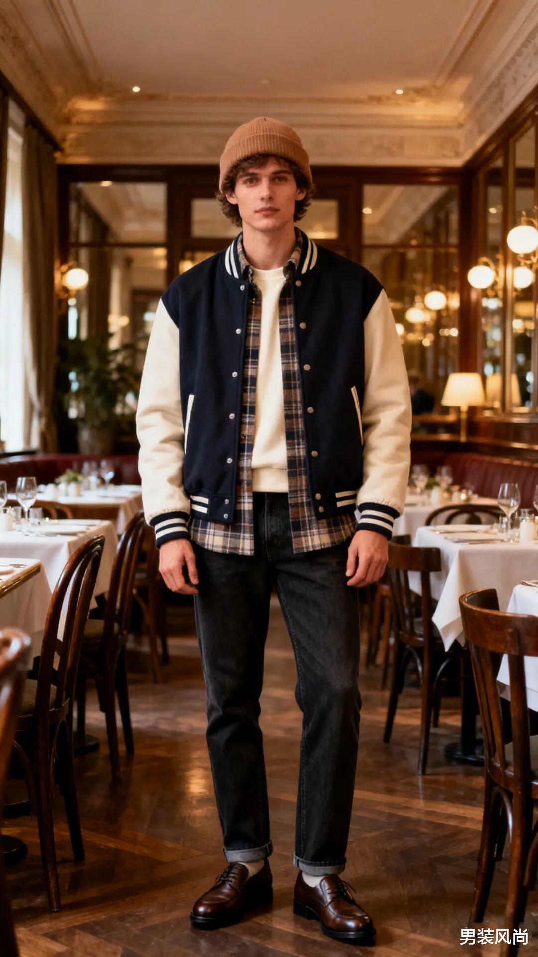 • 约会聚会:在基础搭配上增加细节感,平衡硬朗与温柔。复古棒球服叠穿格纹衬衫,内搭米白打底,下装选深色牛仔裤和复古运动鞋,搭配一顶浅棕色冷帽,既显阳光帅气,又不会过于严肃;如果约会场景偏精致,可将运动鞋换成低帮皮鞋,质感升级,温柔又有型。