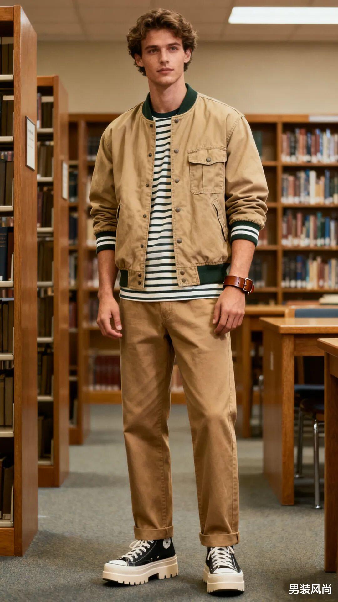 • 下装:直筒工装裤、卡其裤、深色牛仔裤。工装裤首选直筒版型,裤脚可束口可直筒,搭配短靴利落,搭配运动鞋休闲;卡其裤选微宽松款,长度盖过鞋面1/3,修饰腿型还显高;深色牛仔裤优选水洗做旧款,避免过度磨白,复古感更纯粹。