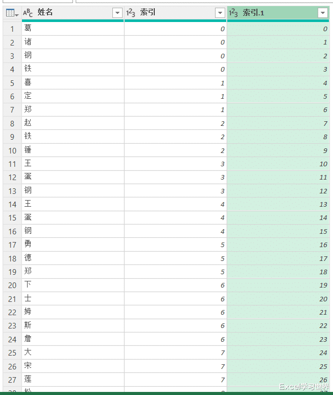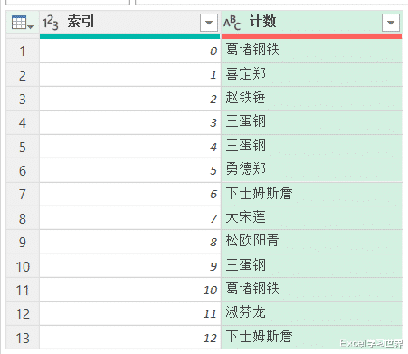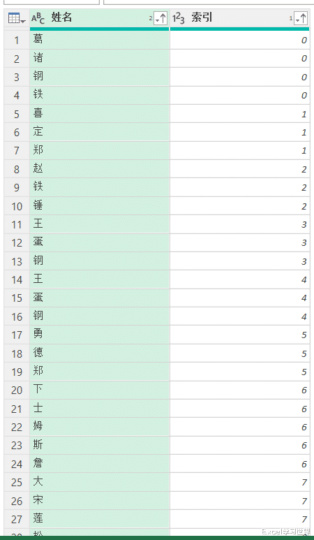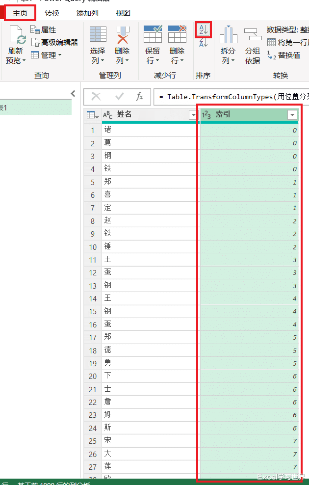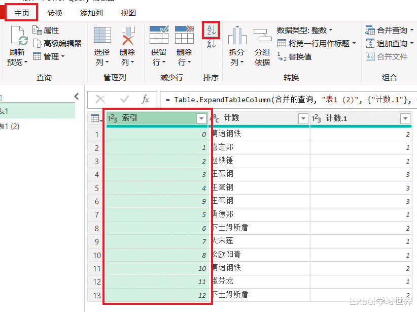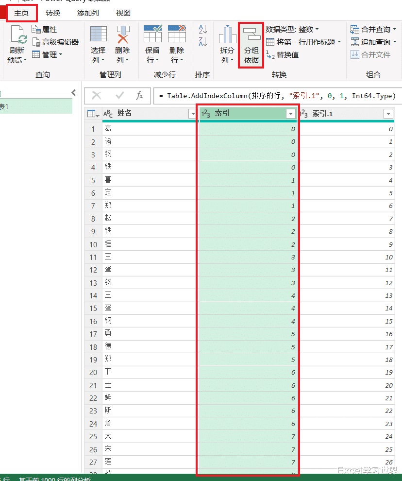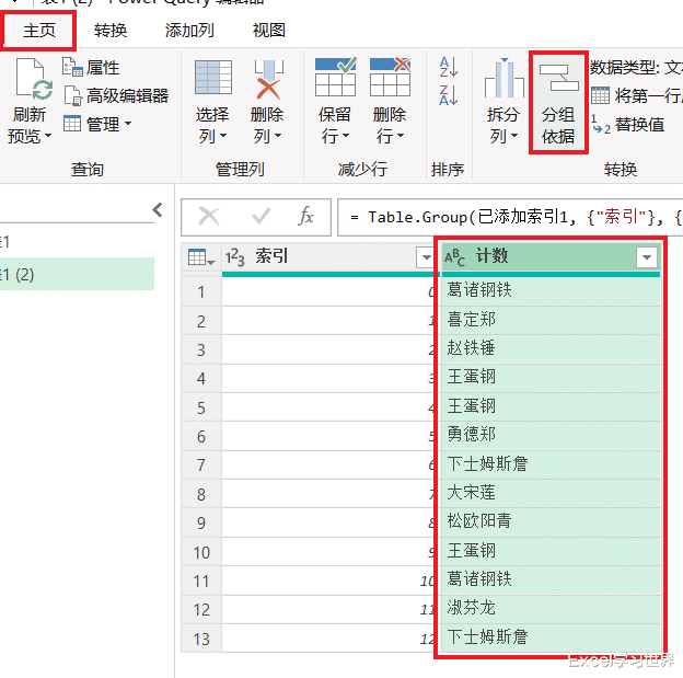 8. 选中“索引”列 --> 选择任务栏的“主页”-->“分组依据”