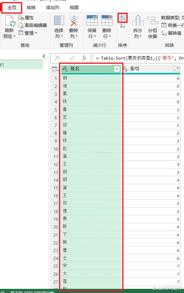 6. 依次将“索引”和“姓名”列按升序排序。