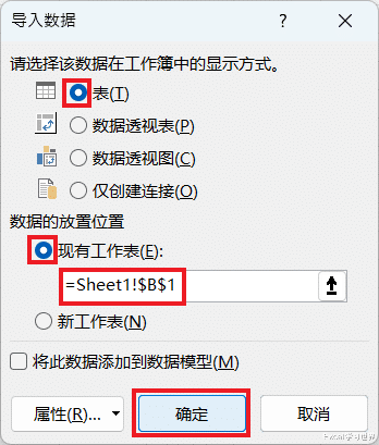 24. 在弹出的对话框中选择“表”--> 选择“现有工作表”及所需加载到的位置 --> 点击“确定”