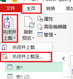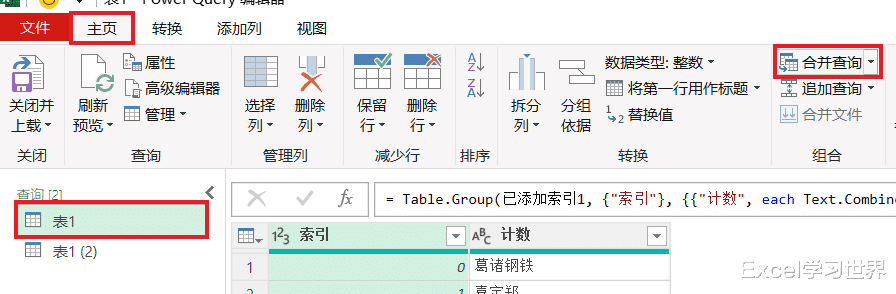 14. 选择“查询”区域中的“表1”--> 选择任务栏的“主页”-->“合并查询”