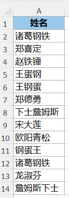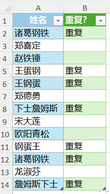 案例:将下图 1 中重复出现过的姓名标识出来,重复的规则是:只要每个字相同,哪怕排列组合顺序不同,也算重复。