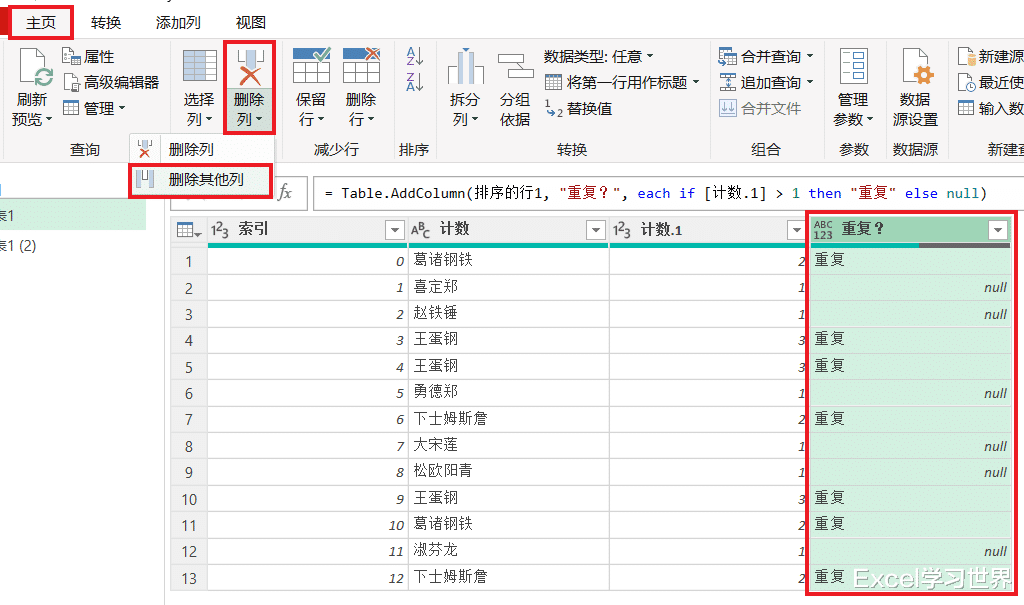 20. 仅保留“重复?”列 --> 删除其他所有列