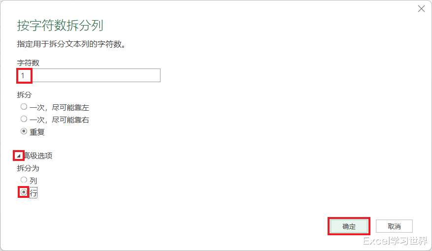 5. 在弹出的对话框中输入 1 --> 点开“高级选项”--> 选择“行”--> 点击“确定”