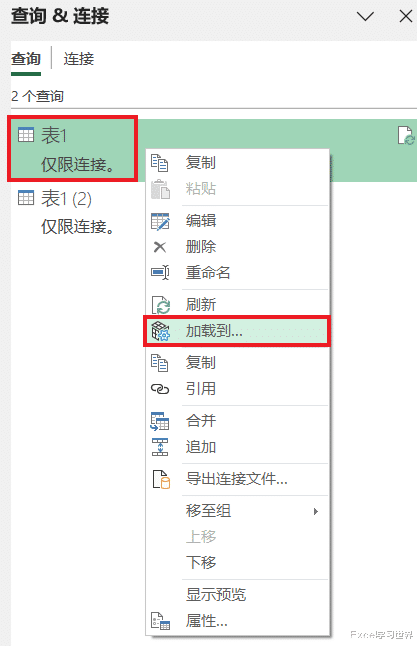 23. 在右侧的“查询 & 连接”区域中选中“表1”--> 右键单击 --> 在弹出的菜单中选择“加载到”