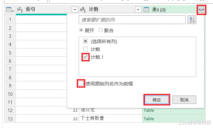 16. 展开“表1 (2)”--> 仅勾选“计数.1”--> 取消勾选“使用原始列名作为前缀”--> 点击“确定”