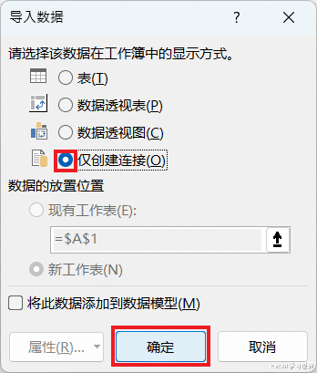 22. 在弹出的对话框中选择“仅创建连接”--> 点击“确定”
