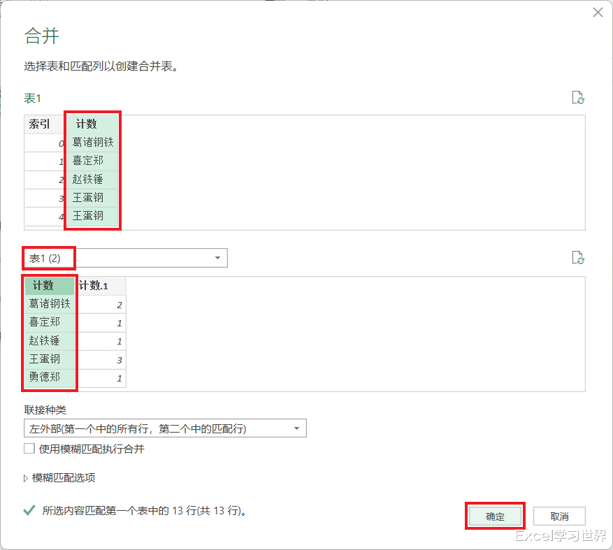 15. 在弹出的对话框中选中“计数”列 --> 在下拉菜单中选择“表1 (2)”--> 选中“计数”列 --> 点击“确定”