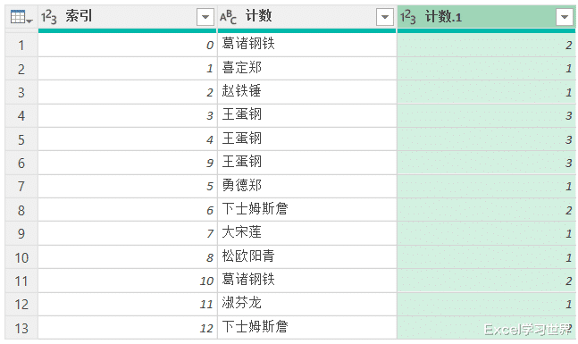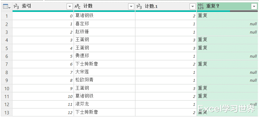 右侧绿色的表格就是重复单元格统计结果。