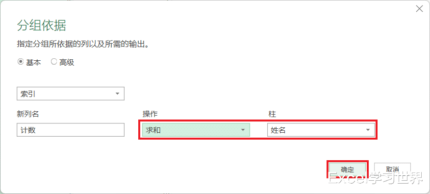 9. 在弹出的对话框的“操作”中选择“求和”,“柱”中选择“姓名”--> 点击“确定”
