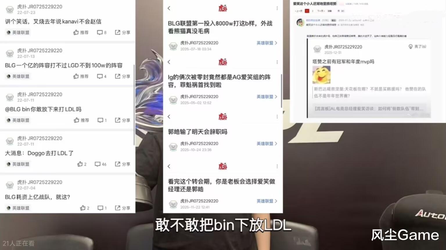 事情的起因,是有虎扑JR发现,撸区有一个账号,最近几年,一直都在论坛里爆料,贬低其他战队或者经理,对爱笑进行吹嘘,最早的发帖时间是22年,这个号最开始嘲讽的是BLG:耗资上亿的战队就这?一个亿的阵容,打不过LGD一百万的阵容,甚至还喊话BLG,把Bin下放次级联赛。