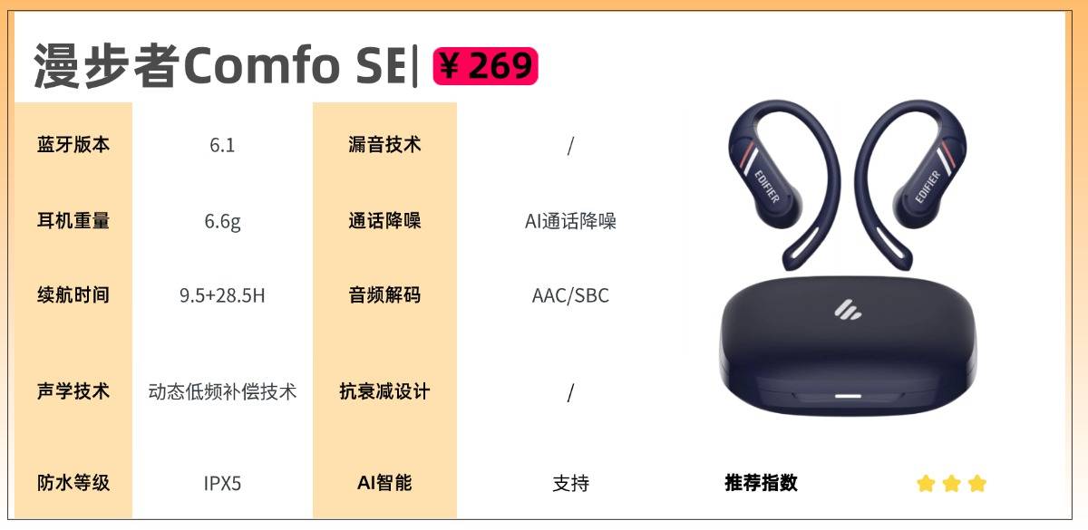 漫步者Comfo SE在两百元价位段表现可圈可点,虽配置不及高端机型,但精准满足了日常使用的核心需求。音质方面,搭载12mm镀钛动圈单元,配合动态低频补偿技术,日常听歌、刷剧的听感都可圈可点,不过高频部分偶尔会略显毛刺。