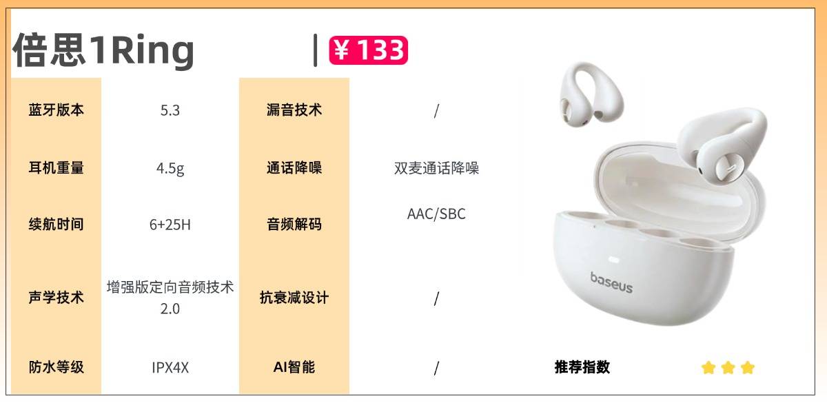 配置上,选用蓝牙5.3传输方案,连接顺畅且抗干扰表现良好。配合定向传声技术可有效规避声音外泄,双麦克风与AI降噪算法协同运作,使通话更为清晰稳定。续航能力同样出色,单次可连续播放10小时,搭配充电盒总续航达40小时,轻松覆盖全天使用需求。此外,IPX4级防水为设备提供了基础抗汗与防雨保障,整体配置均衡无明显短板。