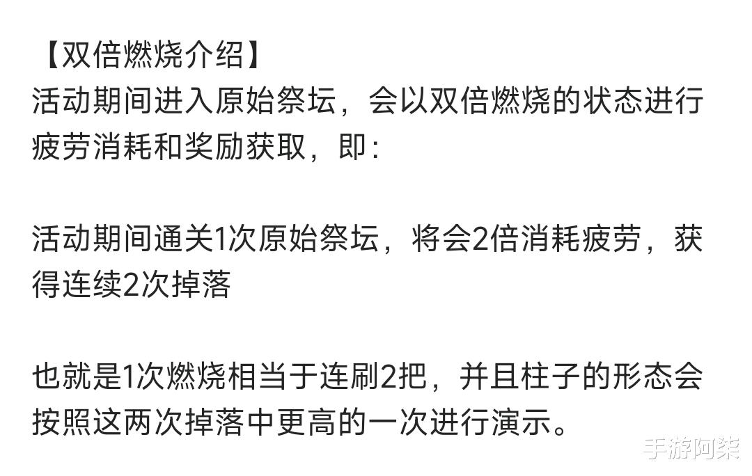 原以为新版本的原始祭坛福利派对活动双倍疲劳燃烧,掉落率也是双倍,结果策划现身答疑,所谓的双倍仅仅是消耗两倍的疲劳,门票打7折,打一盘等于连续打两盘,只是消耗的时间、门票更少了,掉落率不变。