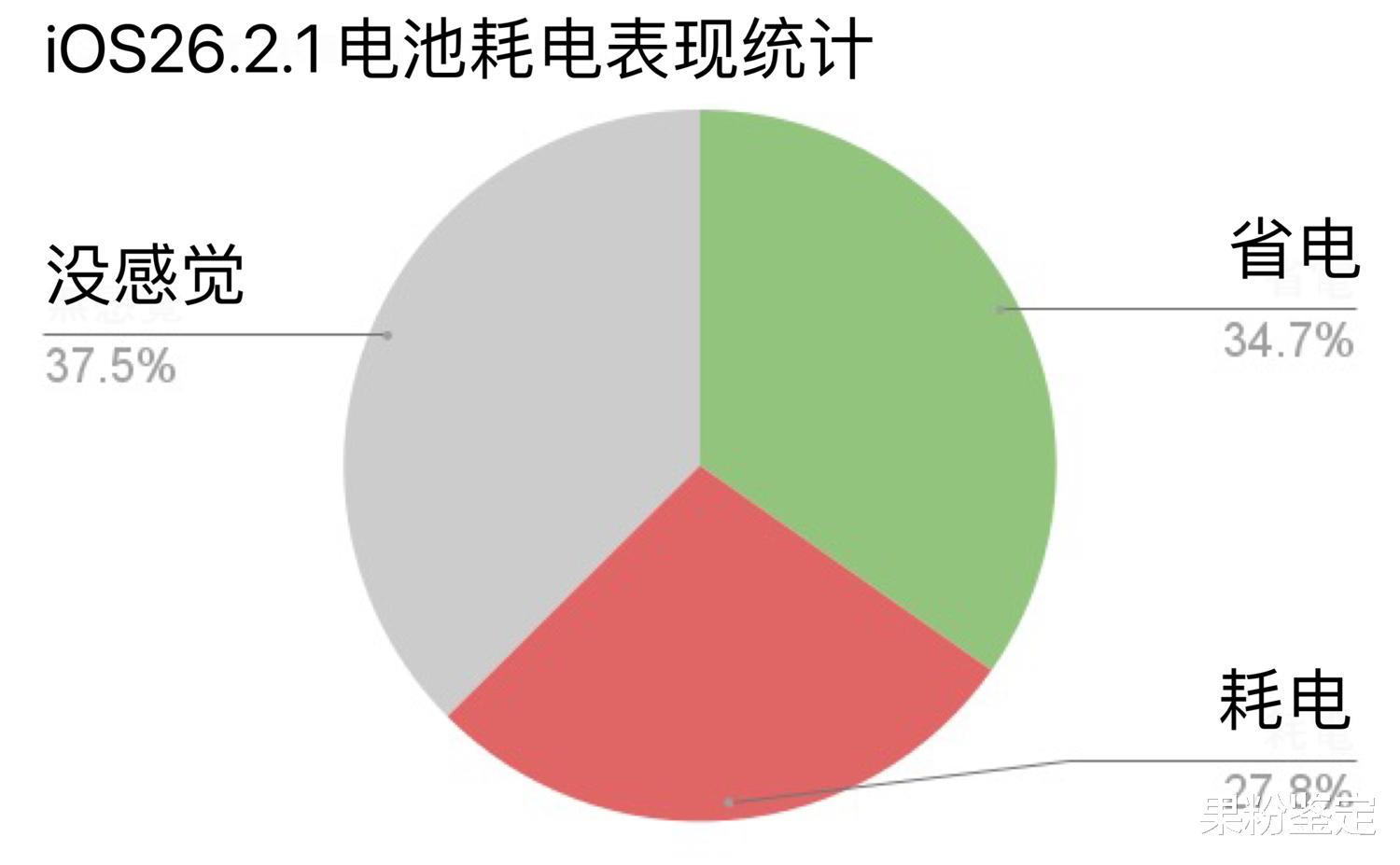 升级到iOS26.2.1是否有耗电情况,根据网友升反馈统计,有37.5%的用户升级到iOS26.2.1是没有变化,有34.7%的用户升级到iOS26.2.1是省电的,有27.8%的用户升级到iOS26.2.1是耗电的。