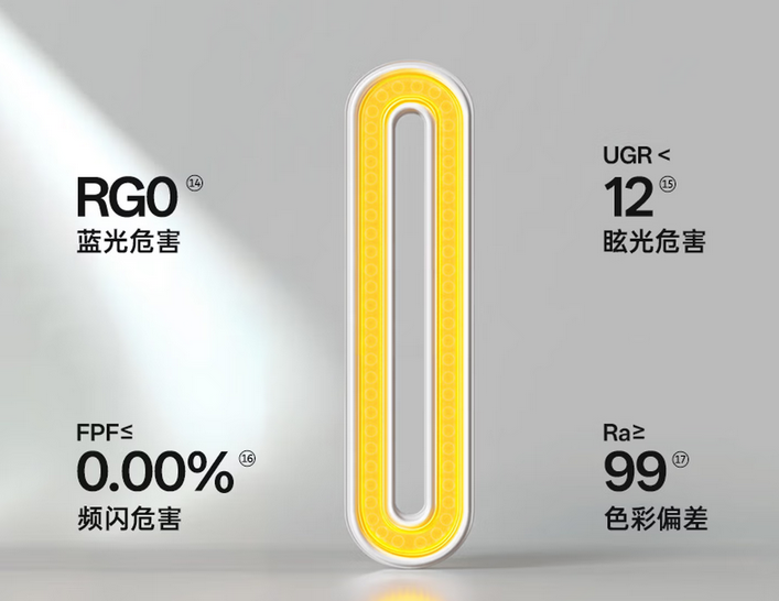 蓝光符合并优于RG0安全等级;眩光UGR<13,低眩光设计避免眼部负担;全程无可视频闪,无频闪危害,整体使用安全大幅提升。
