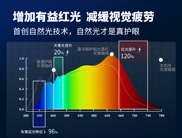 除了核心参数外,在灯珠应用和光谱技术方面,星光Pro同样亮眼。它采用普瑞原装进口灯珠,不仅寿命长达55000H,而且亮度也明显提升,显色性表现更高。采用的自然光全光谱技术同样优秀:有害蓝光含量不足RG0限值的5%,益眼红光含量增加至120%,天青光含量增加20%;不仅杜绝蓝光风险,而且能促 进睫状肌放松,减轻用眼疲劳,客观上起到预防近视的效果。