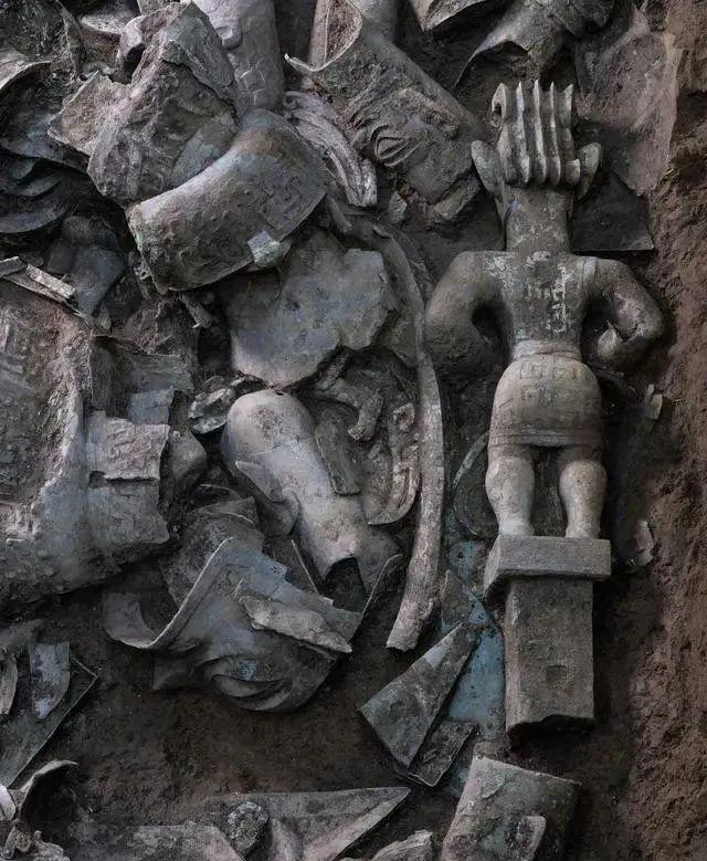 看到8号坑的神坛那儿,站着一个铜人,背上还绑了个背罍,用的是铜带子。有人就琢磨,说不定这个铜人背后,也驮着啥别的铜家伙呢。