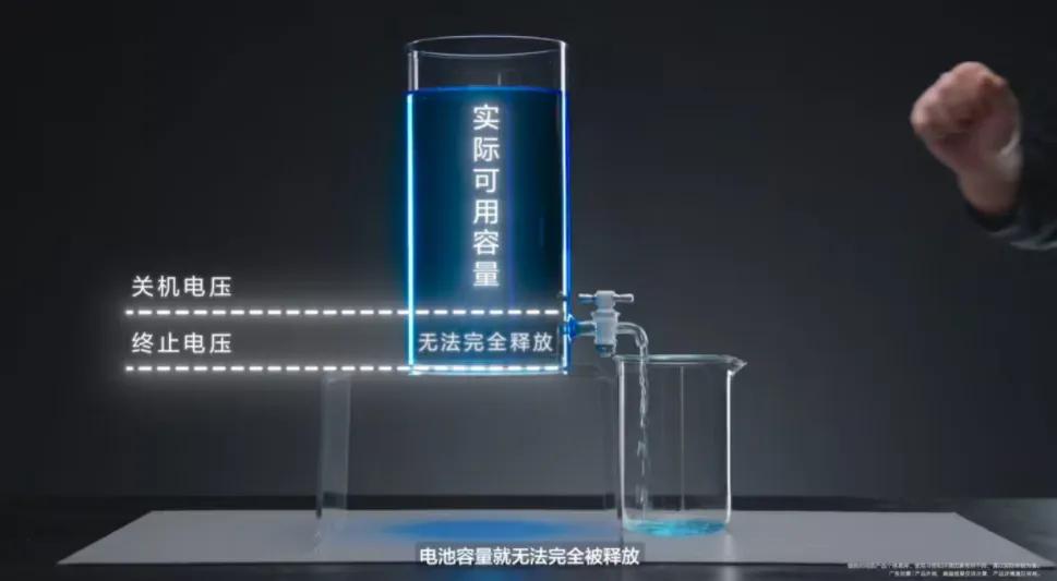 李小龙表示,手机电池从空电到充满电的过程,相当于把一个杯子从空杯到装满水,其电压会从低到高逐步上升。一般手机宣称的电池容量,通常是标称容量,指的是电池从充满电一直放电到“终止电压”,整个过程所释放的总容量。