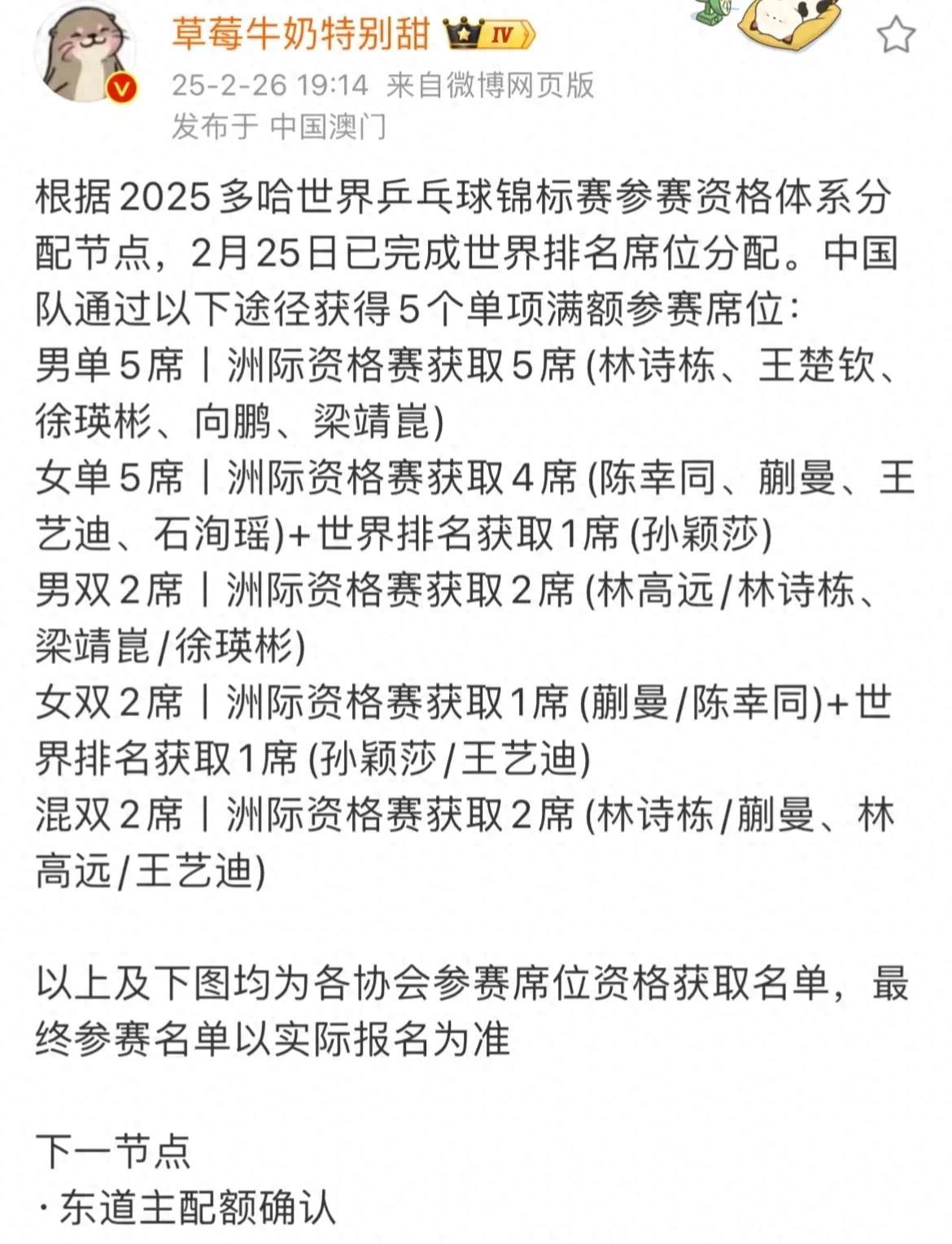 除了世锦赛,国乒还要准备四月份的澳门世界杯。这个比赛的参赛资格已经定了,樊振东孙颖莎黄友政王曼昱王楚钦梁靖崑林诗栋蒯曼陈幸同这几个人都拿到了资格。看这阵容也是相当豪华了,基本上都是国乒的主力选手。