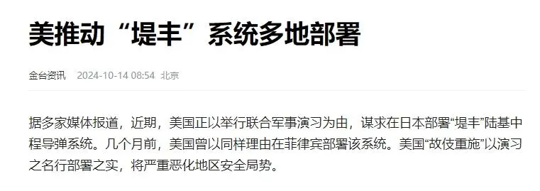 韩媒表示,美军在菲律宾部署了中程导弹发射架“堤丰”,还计划在日本也部署堤丰,在这种情况下,如果韩国的玄武-5被大举投入实战,我国将被困在美国以及美国盟友的中程导弹包围网中,中国因此感到非常紧张。