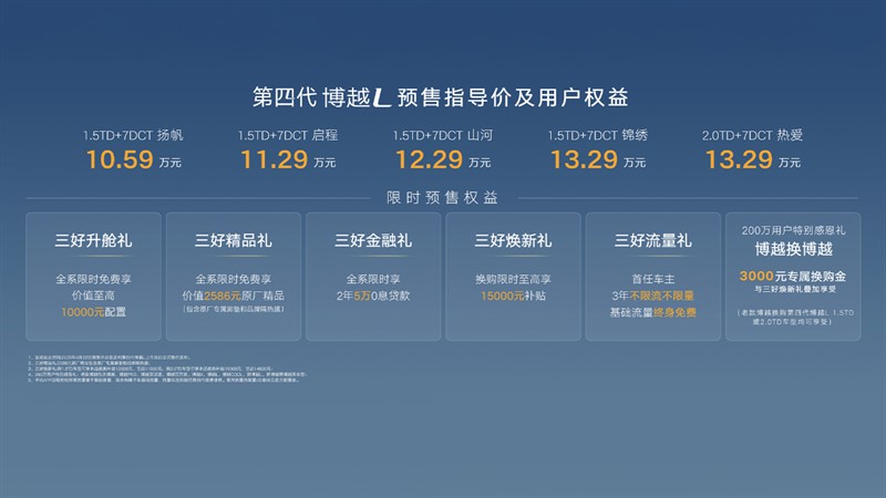 2025年4月22日,“三好SUV”第四代博越L正式开启预售,新车共推出扬帆版、启程版、山河版、锦绣版、热爱版5个版型,预售指导价10.59-13.29万元。作为好看、好开、好智能的新一代“三好”SUV,第四代博越L为超越用户期待而来,采用超越期待的新一代匠心设计、超越期待的新一代智能座舱、超越期待的新一代数字驾控、超越期待的新一代舒享空间、超越期待的新一代驾乘安全,开启燃油车AI平权的新时代。同时,新车不仅以50多项全系标配实现“入门即高配”,更以24项同级独有、26项同级领先优势,成为10万级燃油SUV价值天花板。