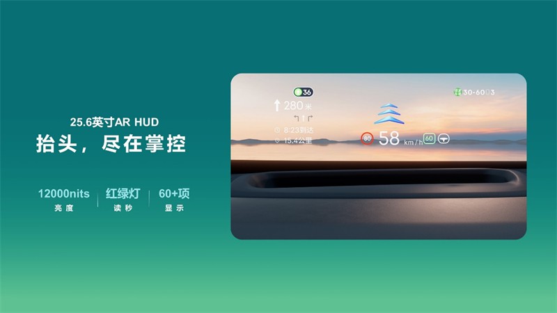 同级尺寸最大的25.6英寸AR-HUD抬头显示,借助实景融合技术,带来沉浸式AR效果,集成红绿灯读秒、导航信息等多项功能,安全尽在掌控。