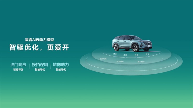 智驱优化方面,新车通过星睿AI云动力模型,实现从规则控制到自主决策的全场景智能寻优,由“人适应车”转变为“车适应人”。在辅助驾驶模式下,车辆可实时感知温度、坡度、导航等要素,并根据用户驾驶偏好自动调整油门响应、空调和换挡逻辑等,通过AI自主学习,打造最符合用户习惯的专属操控体验。