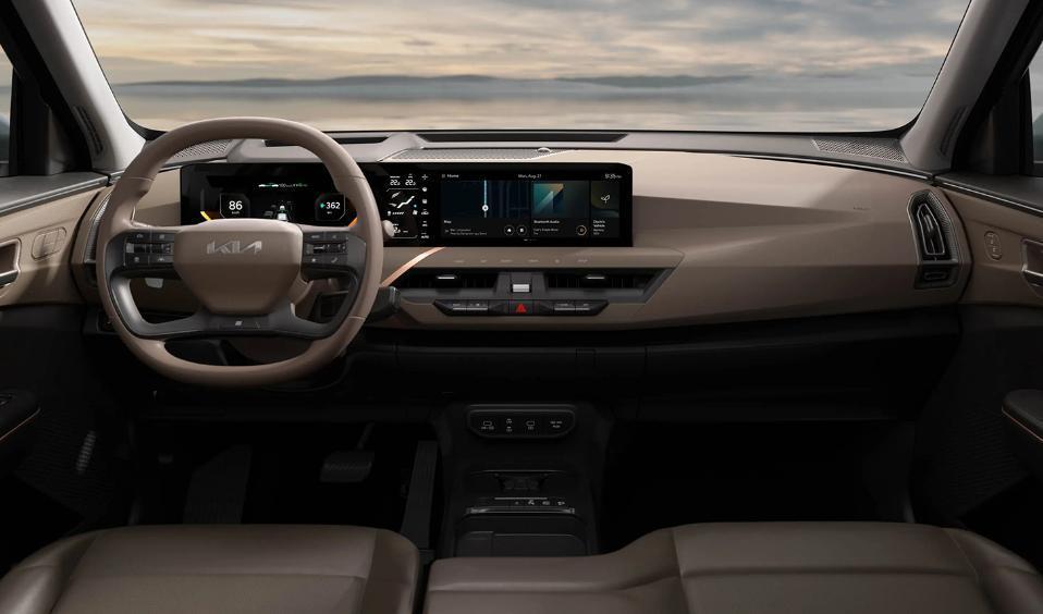 起亚EV5的内饰使用了大量线条来勾勒,层次感丰富,方向盘的造型和中控台线条融为一体,整体性也很足,双12.3英寸双联屏的加入也让整个内饰多了一些科技感。