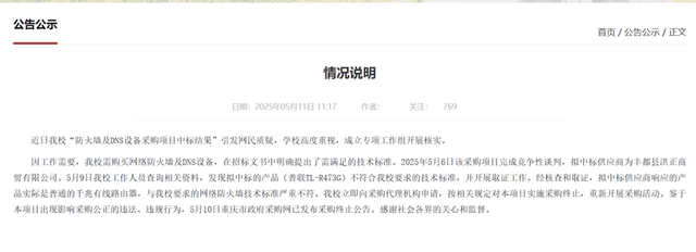 事件曝光后,重庆三峡学院紧急叫停项目。5月10日,中国政府采购网发布终止公告,明确指出存在"影响采购公正的违法、违规行为"。校方表示将重新招标,但未回应是否追究相关责任。