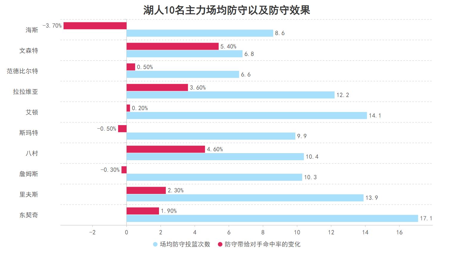 另一方面八村本赛季进攻尚可但防守端惨不忍睹,湖人核心的防守本就不佳正需要其他人来填坑但八村却是将坑越挖越大,本赛季在防守对手投篮时,八村会令对手的总体命中率提升4.6%,这个限制对手命中率的效果为湖人主力的第二差,文森特还可以用身高所限无法护筐来解释但八村就是实实在在的差劲了,因此若想做出更高的贡献提升稳定性与防守积极性是他最需要做到的两件事。