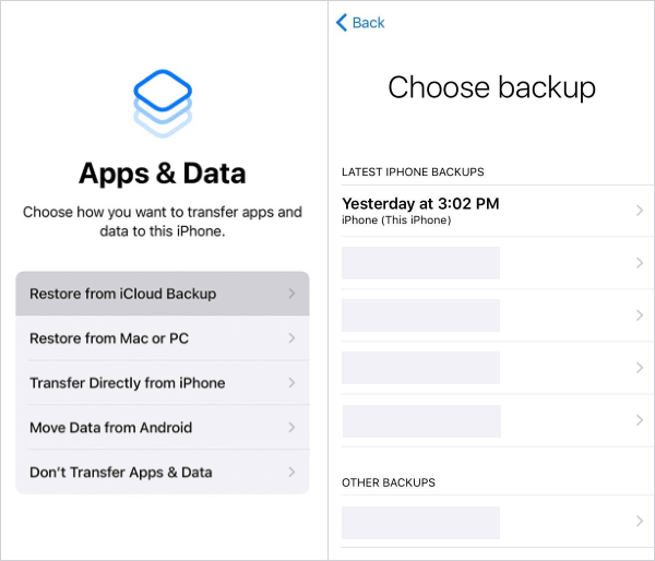 步骤 4. 当您看到“应用程序和数据”屏幕时,选择“从 iCloud 备份恢复”。