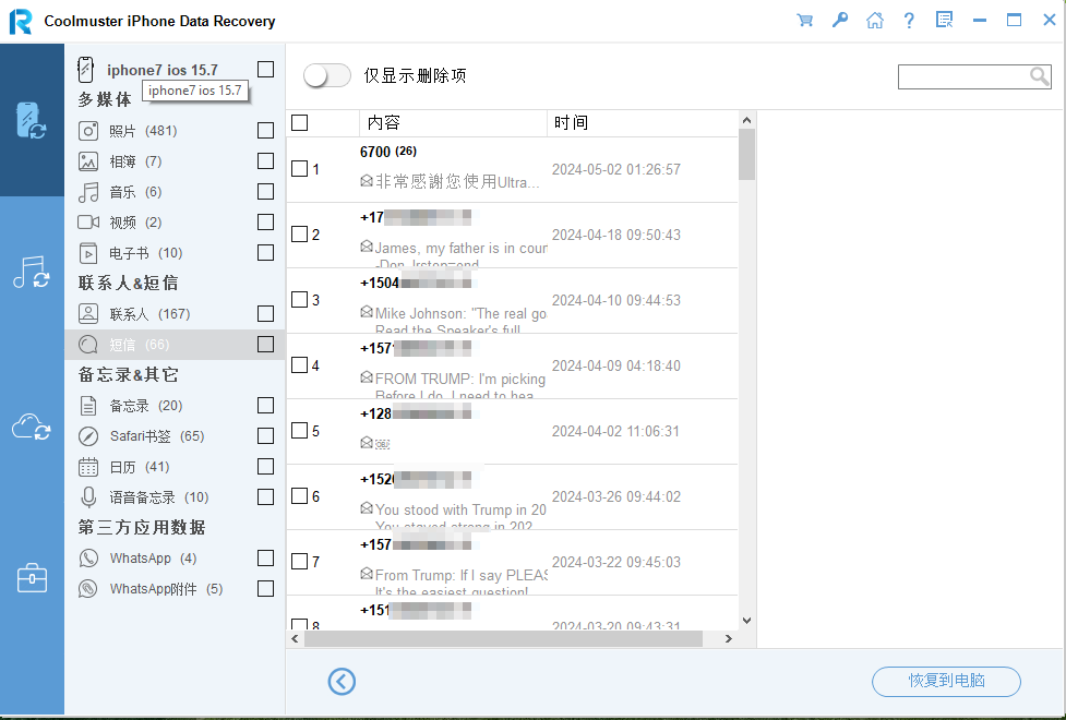 03扫描完成后,从左侧进入“消息”选项卡;然后您可以从屏幕上浏览已删除的消息。选择要恢复的项目,然后单击“恢复到计算机”按钮将其恢复。