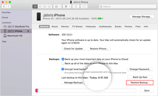如果您使用运行 macOS Catalina 或更高版本的Mac ,则可以使用 Finder 来恢复备份。同样,iPhone 上的现有数据将被备份替换。以下是如何通过 Finder 在 iPhone 上找回已删除的邮件:
