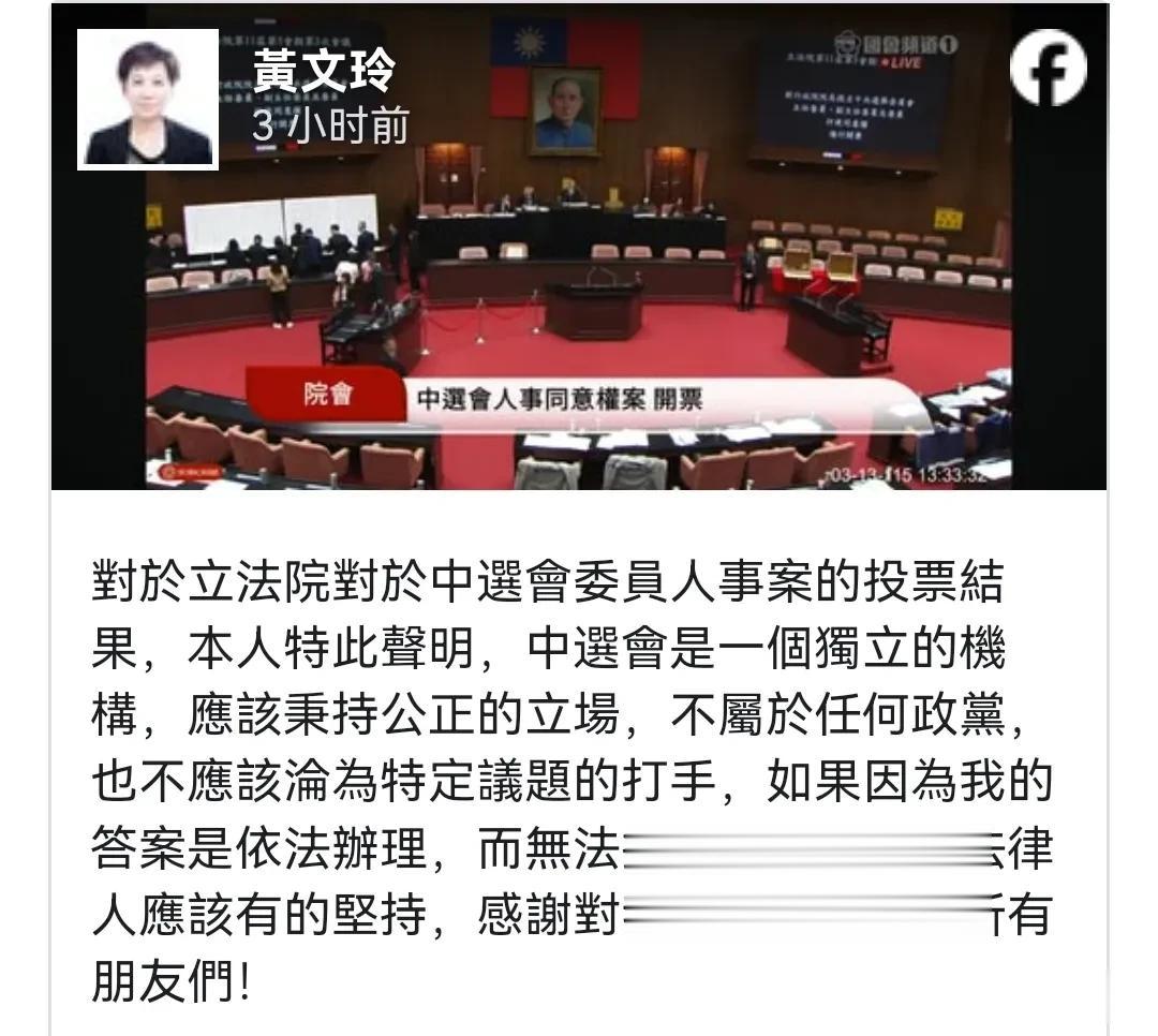 2026年3月13日——在台立院针对“中选会”新任委员的人事同意权投票中,一个意外的名字落选了——黄文玲,她是民众党创党主席柯文哲母亲的干女儿,被视为柯家“自己人”。然而,在蓝白合作的大格局下,这位被外界视为“亲近柯文哲”的提名人,却遭到国民党与民众党团联手封杀,最终未能过关。