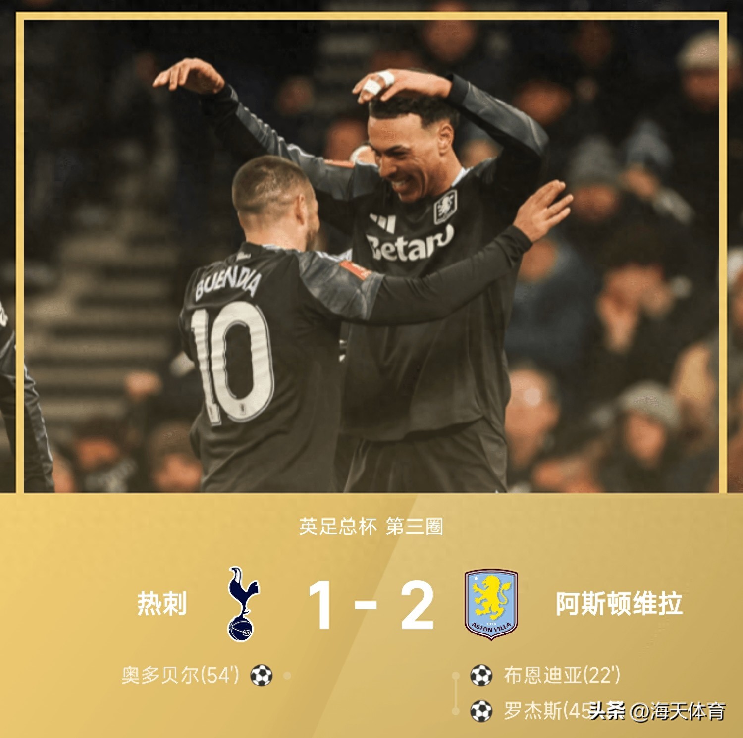 1月11日25/26赛季英足总杯第三轮,阿斯顿维拉客场挑战热刺。上半场比赛布恩迪亚贡献传射,罗杰斯破门,下半场热刺找到状态不断压制维拉,但奥多贝尔的破门难救主,全场比赛热刺还有两球被吹无效。最终全场比赛结束,阿斯顿维拉2-1战胜热刺。