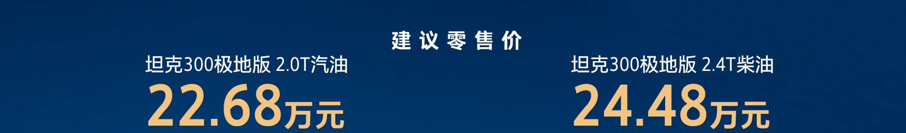 在坦克300全球用户达成50万之际,坦克300极地版正式上市。官方建议零售价,坦克300极地版2.0T汽油22.68万元,坦克300极地版2.4T柴油24.48万元。