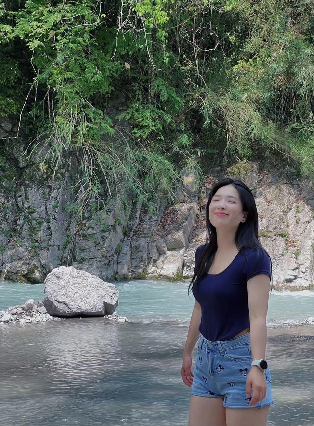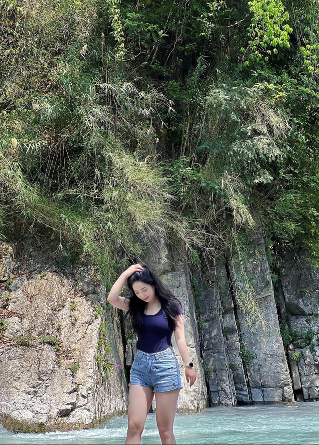 就在这如诗如画的山水间,我邂逅了一位美女。她乌黑的长发如瀑布般垂落在肩头,随着微风轻轻飘动,仿佛带着山水的灵韵。她身着深蓝色短袖上衣,简约而不失优雅,搭配着浅蓝色牛仔短裤,短裤上的卡通图案为她的整体造型增添了几分俏皮与活力。手腕上那块精致的手表,在阳光下闪烁着微光,像是时间的见证者,记录着这美好的瞬间。