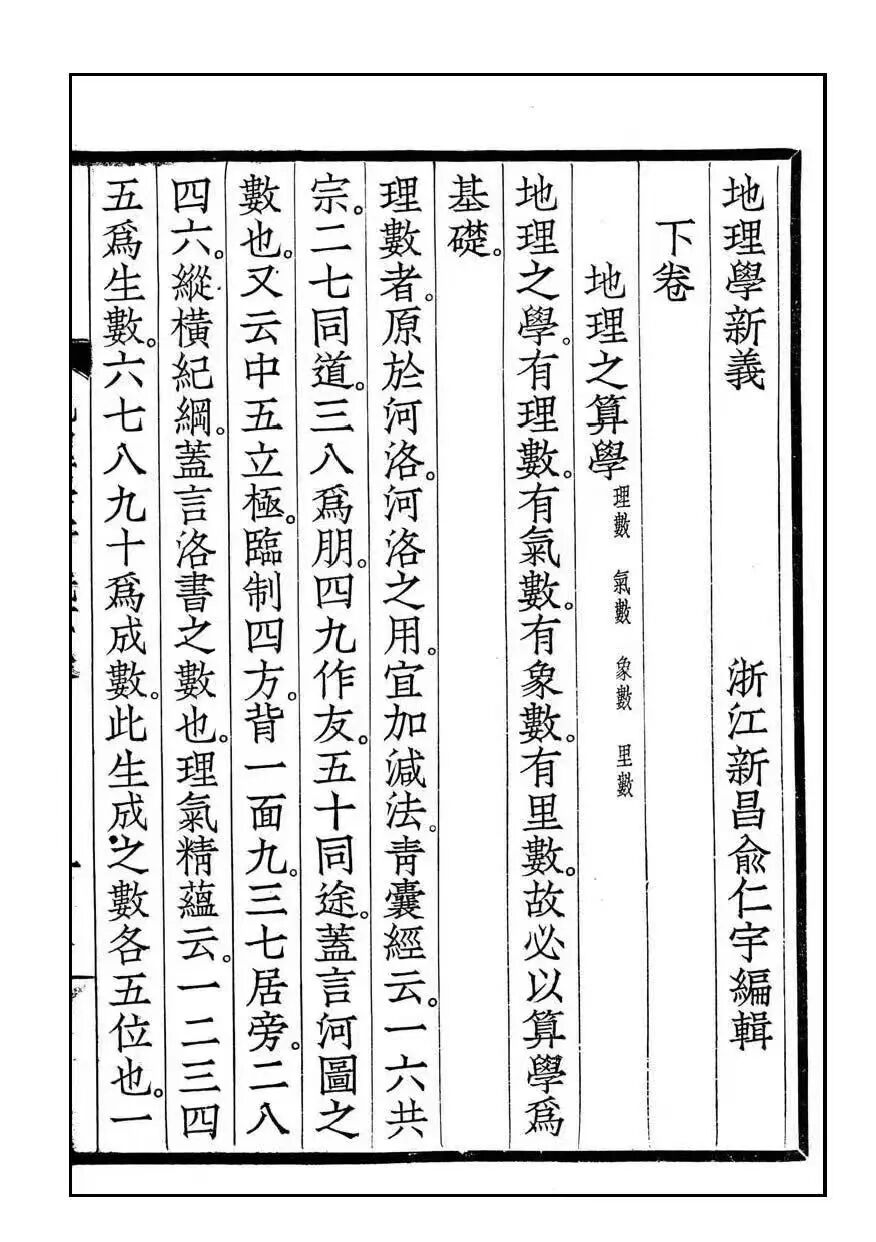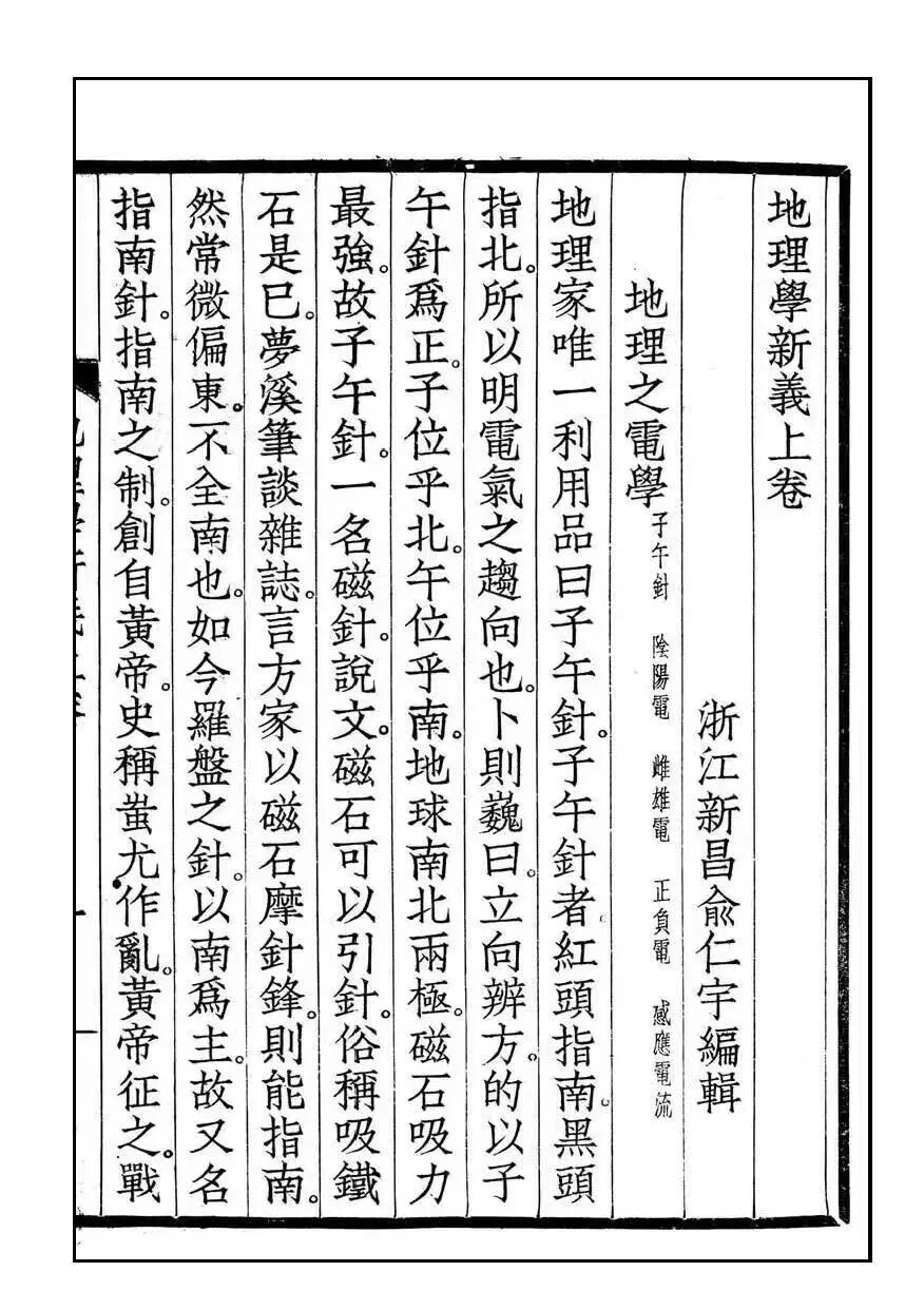 还在寻觅突破传统桎梏的堪舆真义、渴望以全新视角解码风水玄机?这本俞仁宇撰《地理学新义》,以民国二十四年(1935年)余姚文明书局铅活字刊本为底本,99页精炼篇幅,开创“以科学释堪舆”的全新范式——它学贯中西,将物理、地质、天文等现代科学与传统象数、水法秘术深度融合,既是民国堪舆学承先启后的里程碑之作,更是研究流派传承与学术革新的稀缺珍本。
