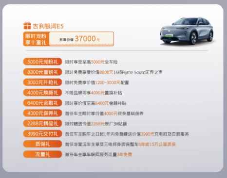 在本次 2 周年限时感恩活动期间(2025 年 2 月 18 日 - 2 月 28 日大定并提车用户专享),吉利银河 E5 推出的优惠堪称豪华 “大礼包”。购车者可享 3000 元保险补贴,涵盖交强险和车损险,实实在在减轻了第一年的用车成本。免费升级价值 8800 元的 16 扬 Flyme Sound 无界之声音响系统,为车内打造出沉浸式的音乐空间,让每一次出行都成为听觉盛宴。此外,还能免费享受价值 1200 - 3000 元的配置升级,提升车辆整体品质与实用性。