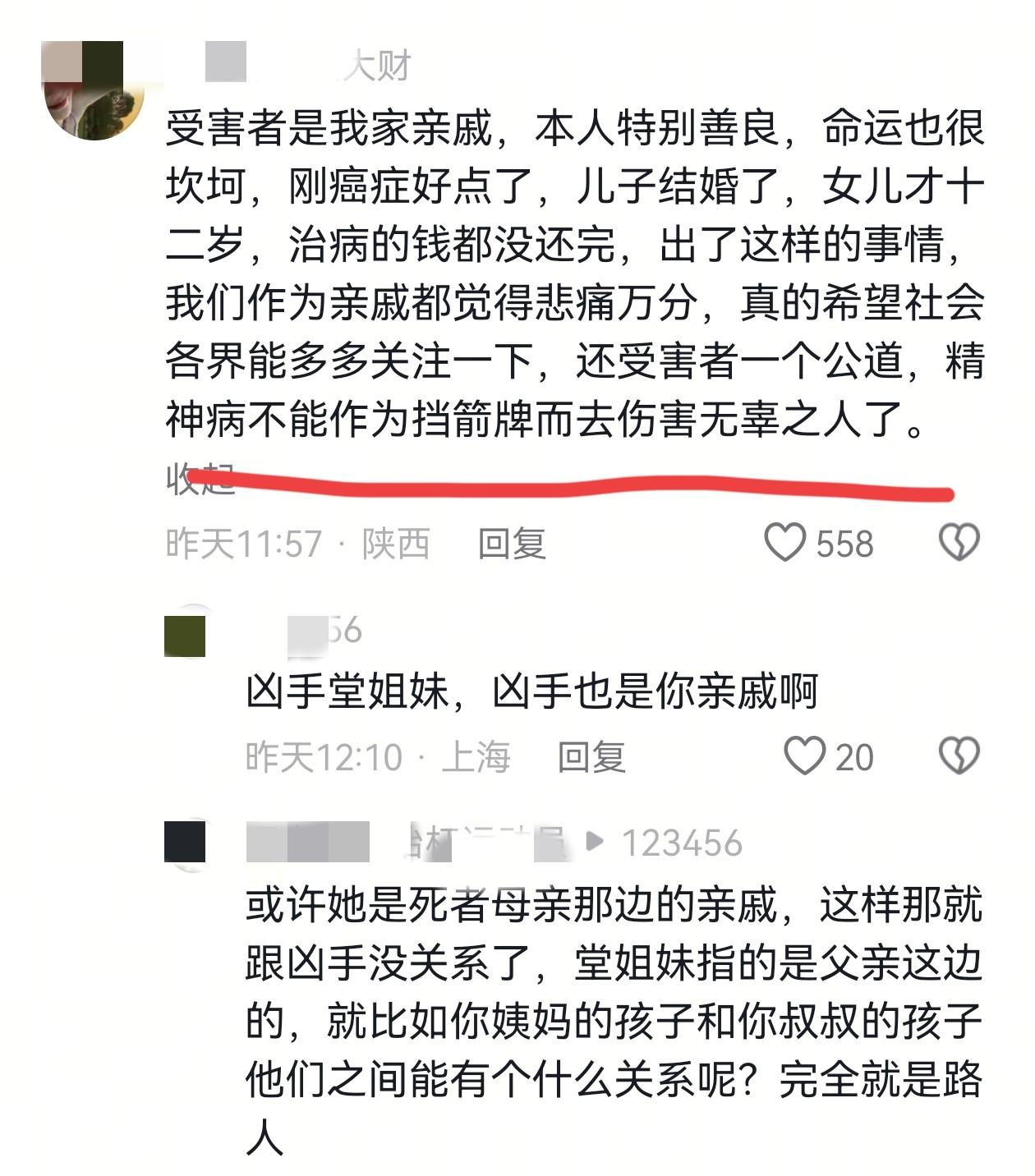 还有一位陕西的网友透露,受害人是他们家的亲戚,平时为人特别的善良,但命运却十分的坎坷,之前得了癌症,本来才刚好点,治病的钱也没有还完,女儿才有12岁,发生这样的事情,让他们非常的悲痛,希望能引起社会各界的关注。