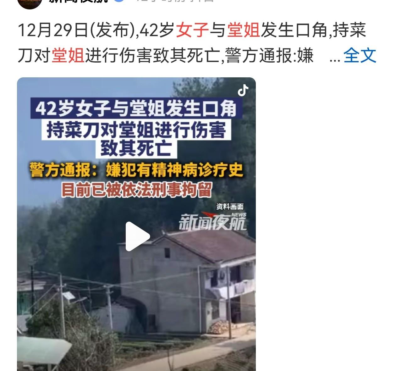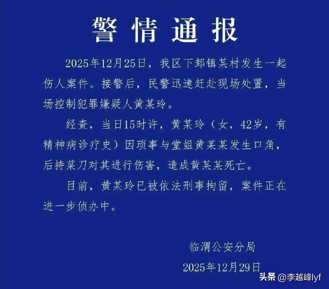 根据警方发布的通报来看,该案发生在2025年12月25日,当时在辖区内的一村庄,两名堂姐妹发生口角,结果42岁的堂妹,手持菜刀向堂姐砍去,最终导致对方死亡。