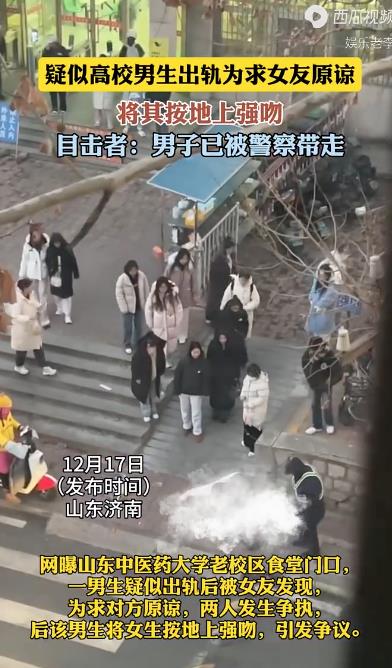 俗话说在天愿作比翼鸟,在地愿为连理枝,神仙眷侣的爱情故事令人羡慕,但是因爱生恨的悲剧也时有发生,据津云媒体12月17日报道,山东中医药大学老校区食堂门口,男生疑似是出轨被女友抓包,或许是爱的挽留男生不顾一切将女友摁地强吻,周围保安和学生们都在围观和劝导,但依然不为所动,真是看傻了众人啊。